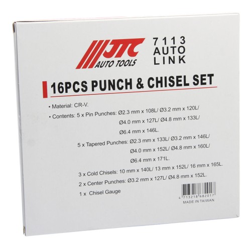 JTC-7113 - Набор зубил и выколоток 16 предметов в кейсе JTC - Инструменты изготовлены из закалённой хром-ванадиевой стали._В комплекте:Бородок: 2, 3, 4, 5, 6 мм. — 5 шт.Выколотка: 2, 3, 4, 5, 6 мм. — 5 шт.Зуб...